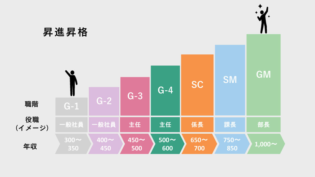 昇進・昇格は、日頃の成果と昇格試験の結果を総合的に評価して決定します。