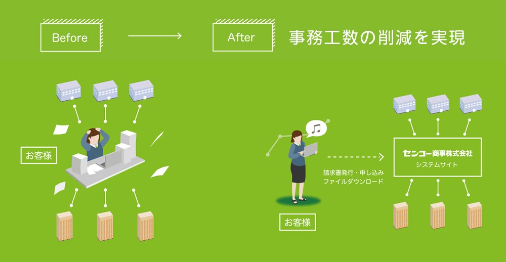 csv形式ファイルダウンロードなど、さまざまなサービスをご利用いただけます。インターネットで24時間いつでもご利用可能です。お客様の利便性の向上とコスト削減、事務工数の削減につながっています。