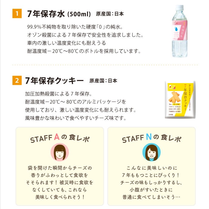 水・食料は安心の国産品で、7年の長期保存が可能です。