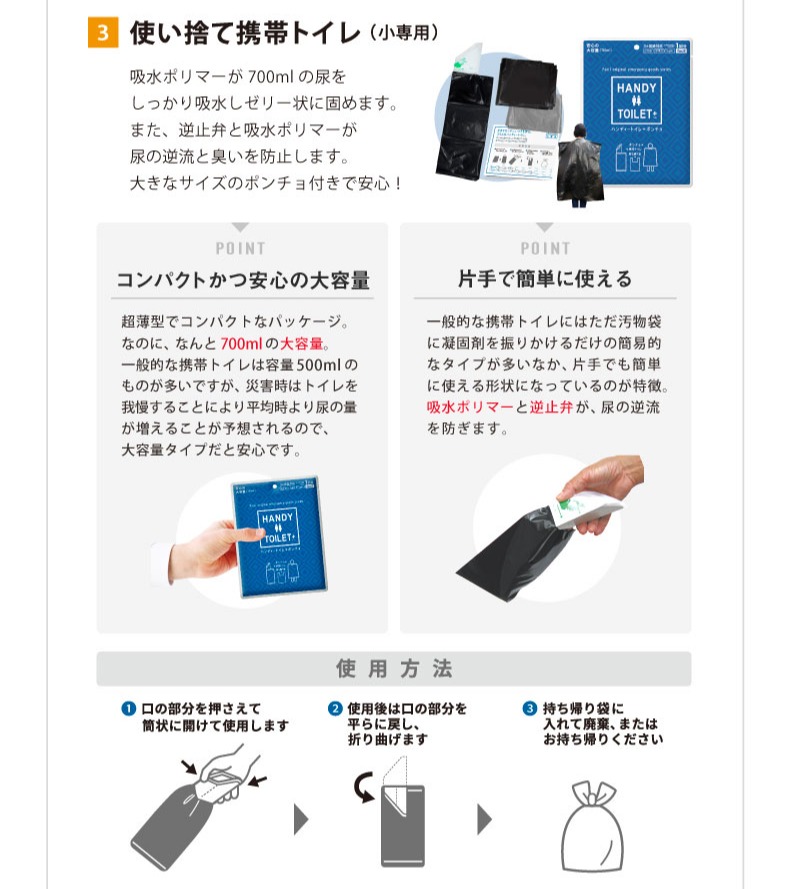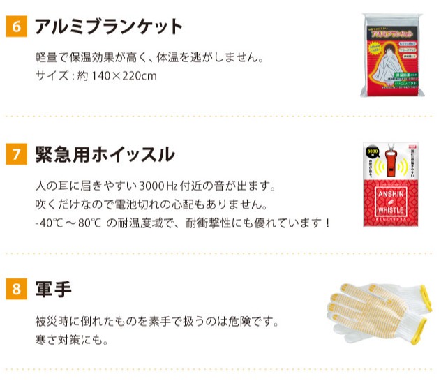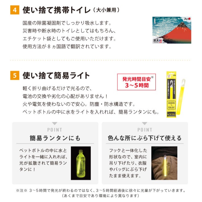 使い捨てトイレは大小用をご用意。夜間を想定したライトやブランケットも装備。建物の崩壊や携帯電話の不通まで想定しています。