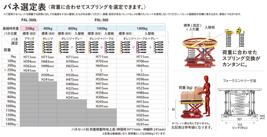 PAL-360は、基本は400kgの荷重で最縮するオレンジのスプリングのみとなります。 ご注文時には、荷重に合わせて、グレーとパープルのスプリングをご検討ください。 PAL-360Lは固定スプリング1つとなります。(スプリング追加不可)