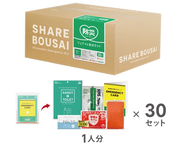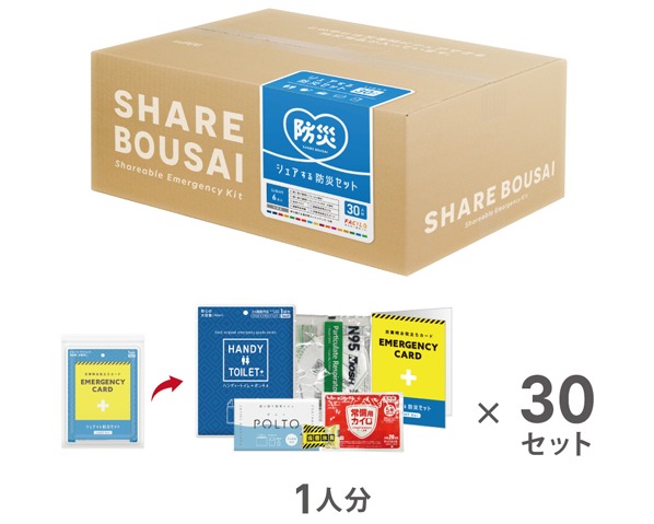 最大30人分の防災用品が入った、「シェアする防災セット」。 車やオフィス、店舗などに備えることで、従業員のためはもちろんのこと、周りの人々に防災用品を配付することができます。 地震や豪雪などの災害や、不測の事態が起きた時に備え、企業としてできる社会貢献のひとつのカタチです。
