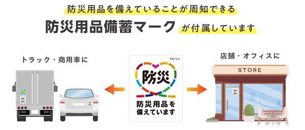 トラックや営業車などの車内はもちろん、オフィスや店舗に置いても「防災をシェア」できます。