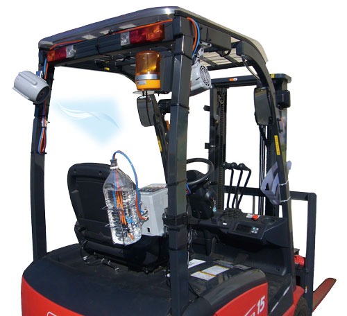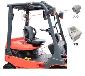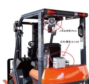 「エヴァポ・クーラー」は、フォークリフトに取り付けることができるミストクーラーです。ミストが気化することで冷たくなった空気を運転手の首筋に送り、最大8℃の冷却効果をもたらします。