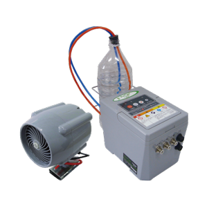 エヴァポ・クーラーは小型低圧エアポンプ使用で、消費電力は最大65W程度です。フォークリフトのバッテリー負担を気にすることなく長時間ご使用いただけます。