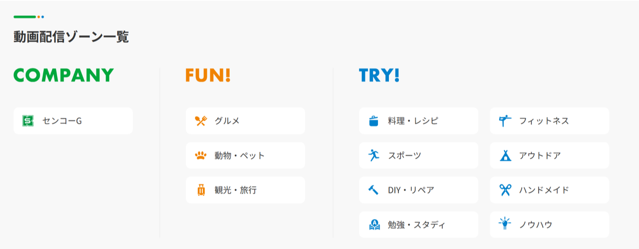 癒されるル動物動画、役立つDYI動画、英語など学習コンテンツ、カラダのためのエクササイズなどグルメ、動物・ペット、観光・旅行、料理・レシピー、フィットネス、スポーツ、アウトドア、DIY・リペア、ハンドメイド、勉強・スタディ、ノウハウの11ゾーンに「暮らしやビジネスに役立つ」、「自分を磨ける」、「癒される」コンテンツを配信しています。有害サイトと同じプラットフォームで視聴されるのは嫌だという方、自社HPで動画ギャラリーを設置するのは費用負担が重いという法人の方々などお勧めです。