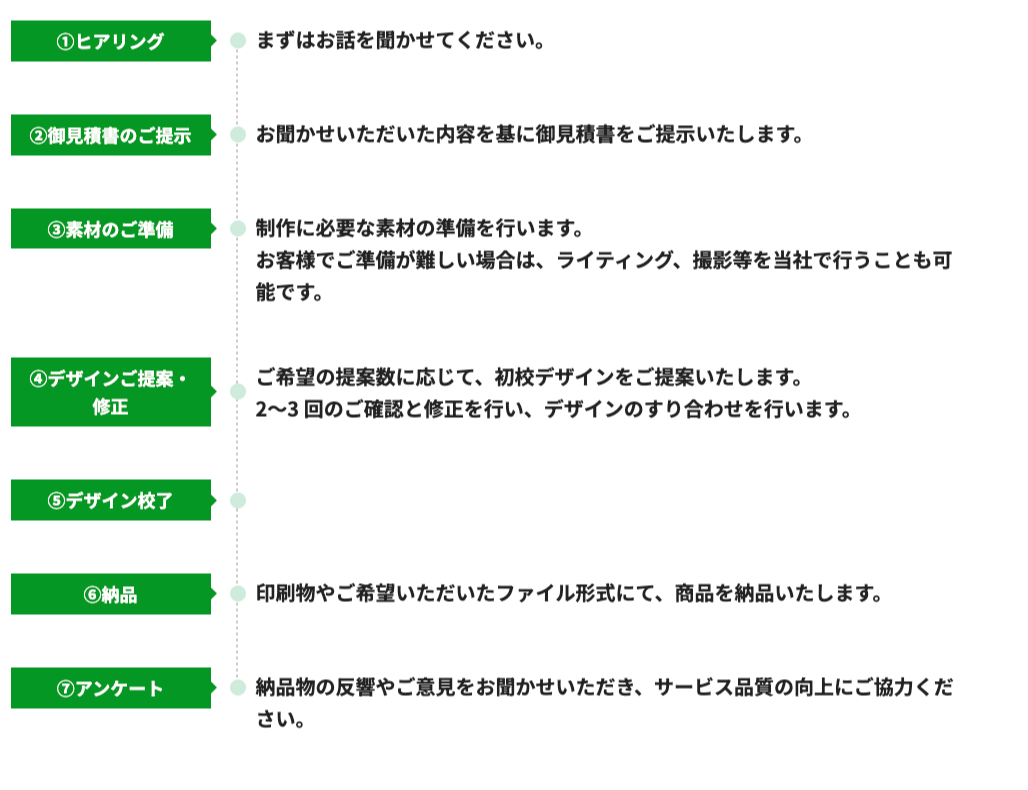 多岐にわたる制作も企画からワンストップの体制を整えており、一貫性のあるイメージで制作を行う事が可能です。